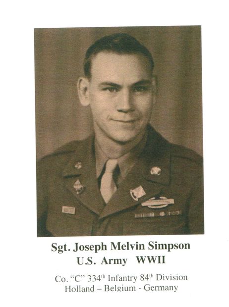 Joe Simpson was born and raised on a farm in Texas. He was married to his High school sweethart Billie for over 74 years. He was drafted in 1944 and went to Ranger school, was injured in training , so he was sent back to the regular Army. He was being trained to fight against the Japanese, but was to Europe to fight the Germans. He sailed on the "Queen Mary" with thirty six thousand men.